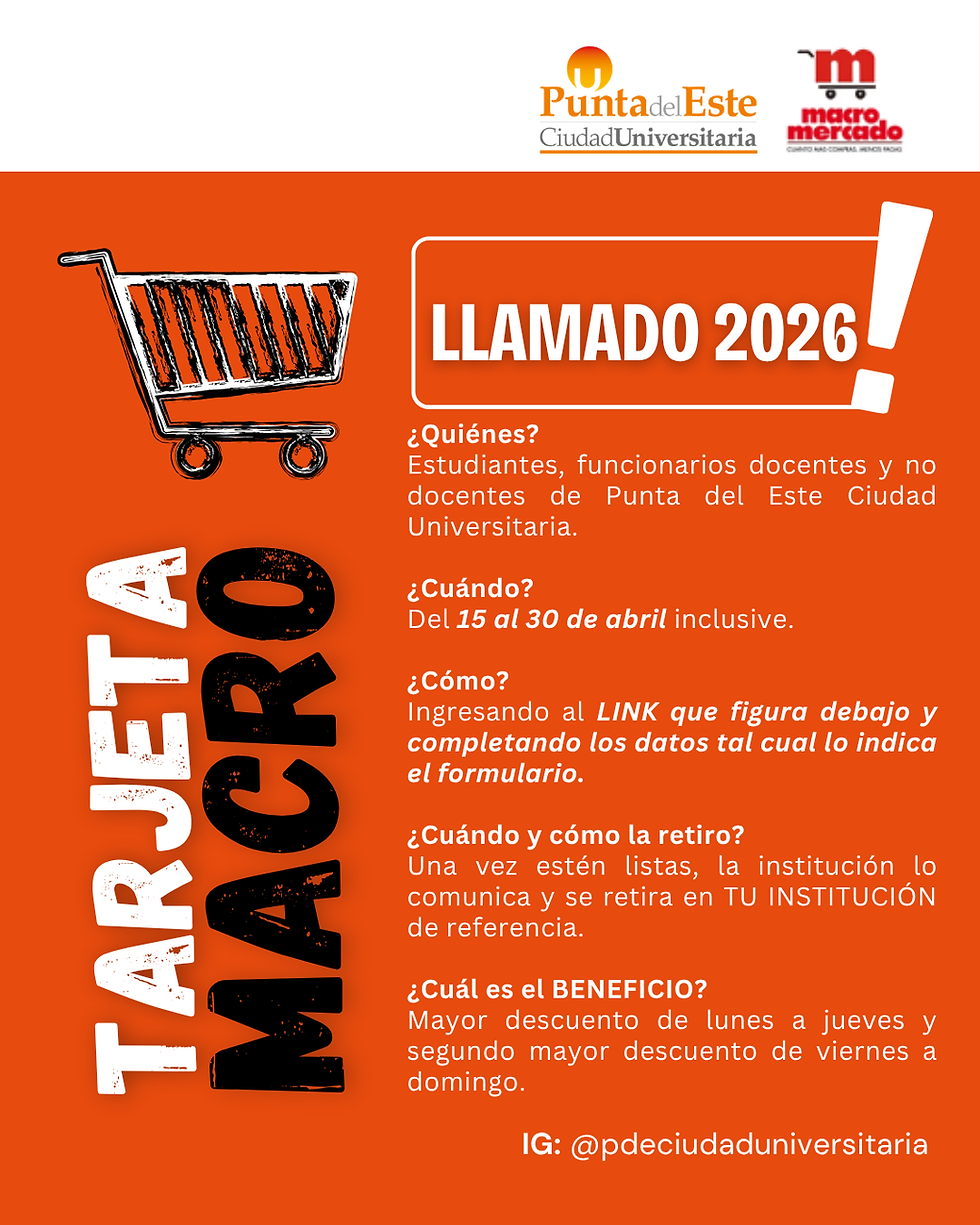 Solicita en tu institución de referencia el link para inscribirte y acceder a la tarjeta de beneficios Macro Mercado - Punta del Este Ciudad Universitaria 2020. Las inscripciones se encuentran abiertas hasta el 30 de abril.